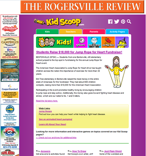 Campbell, Publisher of the Rogersville Review gives an in-depth testimonial to the benefits of publishing Kids Scoop™. The page and screenshot samples are also from the Review.