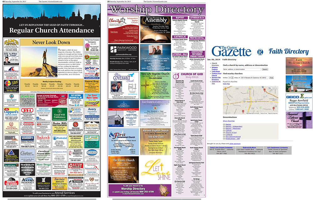 Gastonia, NC publishes our Church Page in the Gaston Gazette and online. They publish their religion section on Saturdays to a circulation of 18,000. It is an example of providing color at a value price along with the total worship package of print + online. The business sponsor page is on the left showing a full page of ads -- this is a very successful page with 60 Sponsors per week bringing in $3,000 per month. Each participating business receives an online signature ad along with their $11.75 per week print ad. The Churches shown on the Worship Directory (Center Page) can choose between a display ad or a classified listing – this helps keep this page full with churches at various price points while while producing $1,250 per month. The program represents annual revenue of $50,000...